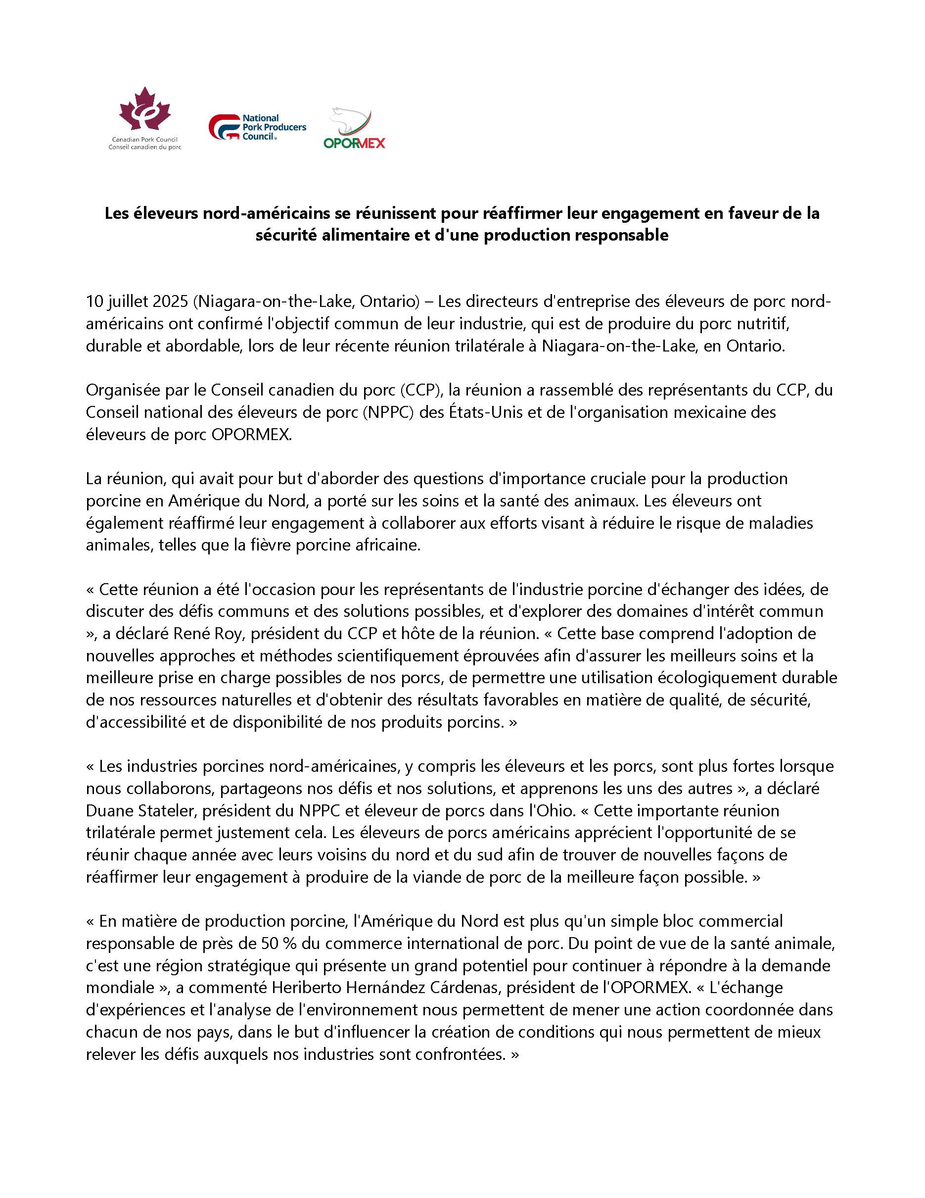 La réunion s’est concentrée sur les priorités communes, notamment la santé animale, le commerce, la durabilité et l’alignement réglementaire. Les trois organisations ont réaffirmé leur engagement à renforcer la collaboration et à promouvoir un secteur porcin compétitif, résilient et durable dans toute l’Amérique du Nord.